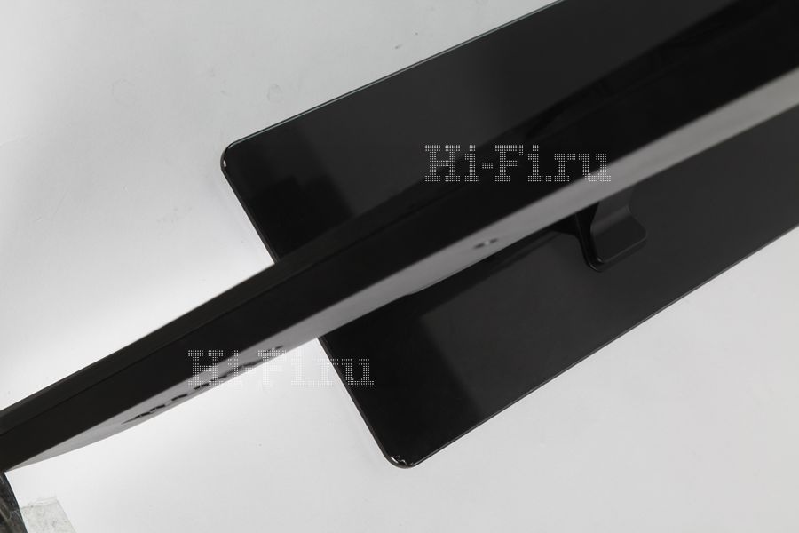 Toshiba 40L3453R заметно выделяется на фоне других моделей в тесте. И это видно невооруженным глазом: он значительно толще большинства современных телевизоров, причем не только в нижней части, где обычно располагают динамики аудиосистемы, но почти по всей площади дисплея, и только самая верхняя часть корпуса у него узкая. Кроме того, почти все разъемы выведены на заднюю панель, что обязательно необходимо учитывать при настенном креплении — для кабелей нужно будет оставить еще немного места. Дизайн передней панели в целом хорош — строг и лаконичен, а вот настольная подставка смотрится уж очень просто из-за применения обычного шершавого пластика.