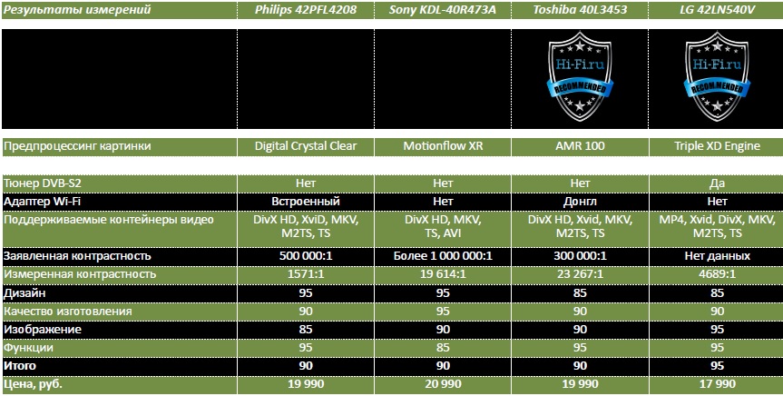 Toshiba 40L3453R, обладая не худшим изображением, снабжен отличным медиаплеером и может работать с приложениями Smart TV. Ему не хватает лишь умения проигрывать дорожки в DTS при воспроизведении HD-видеофайлов. Зато он способен передавать их на ресивер. LG 42LN540V не имеет функций Smart TV, но у него далеко не худший медиаплеер, а главное — есть тюнер стандарта DVB-S2 для приема спутниковых программ. Да демонстрируемая им картинка — одна из лучших в тесте. В итоге Toshiba 40L3453R и LG 42LN540V получают от нас искренние рекомендации, но адресованы они разным покупателям. Toshiba идеален для городов с быстрым Интернетом, LG — для мест, где с Интернетом и приемом обычных программ могут возникнуть проблемы и выручает спутниковое вещание.