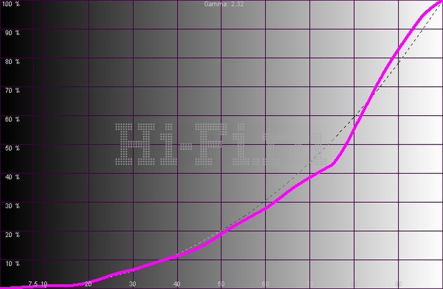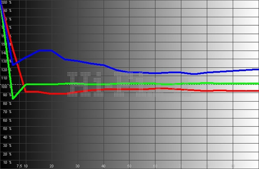 Телевизор уже изначально настроен отлично. При выключенных динамических регулировках яркости подсветки уровень черного составляет 0,007 кд/м2, яркость белого при этом — 137,3 кд/м2. То есть предельная контрастность получается равной 19 614:1! В одном кадре на шахматном поле (ANSI) этот параметр достиг впечатляющего значения 2290:1. Градации отображаются корректно, а график яркостного отклика (рис. 2) совпадает с идеальной кривой. Цветовой охват (рис. 1) по ширине удовлетворяет стандартным требованиям HDTV, но смещен в синеву. Это смещение видно и на балансе цветовых компонент (рис. 3), отчего реальная цветовая температура по всему диапазону даже при выставлении в меню «теплого» пресета превышает 7800 К при рекомендованных 6500 К.