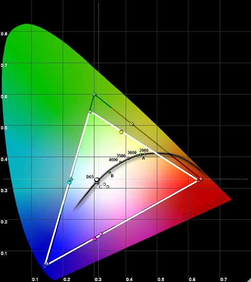 Измерения проводились в затемненном помещении на экране с диагональю 106 дюймов и коэффициентом отражения 1.0. В качестве отправного был выбран Пользовательский режим, позволяющий проводить полный спектр настроек изображения, но при этом не купирующий цветовые характеристики модели. Цветовой охват (рис.1) у нее в пределе оказался меньше стандартного треугольника ВТ.709, что характерно для большинства недорогих проекторов. На нем явно видно небольшое смещение крайних координат в синюю область. Но при выборе теплой цветовой температуры в меню баланс цветовых составляющих (рис.3) отлично уравновешен и достаточно ровен за исключением самой темной области. Поэтому и реальная цветовая температура при этом на большей части диапазона яркостей совпадает с рекомендованными 6500К. Яркость белого в режиме работы лампы SmartEco превышает 204 кд/м2. Но уровень черного при этом остается довольно высоким – 0,256 кд/м2. Соответственно, реальная контрастность без использования динамических регулировок составляет около 797:1.