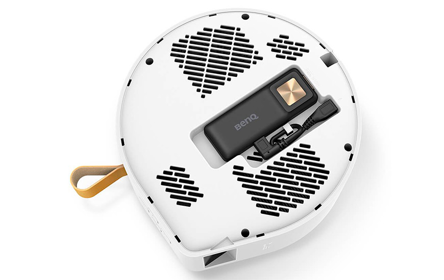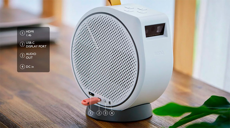 Внешне проектор BenQ GV30 напоминает очень популярные сегодня портативные Bluetooth-колонки с ремешком для переноски, однако увеличенные размеры намекают на то, что перед нами не простая беспроводная акустическая система. При этом со звуком у проектора всё в полном порядке – пожалуй, в этом отношении он даст фору многим стационарным моделям. За воспроизведение саундтреков к фильмам и играм отвечает акустическая система формата 2.1 от treVolo, включающая по два широкополосных динамика мощностью 4 Ватта на каждой боковой стенке и 8-ваттный низкочастотный динамик на верхней панели. Производитель особо подчеркивает, что в драйверах применена неодимовая магнитная система, а за обработку звука отвечает мощный сигнальный процессор, добавляющий звучанию объема.