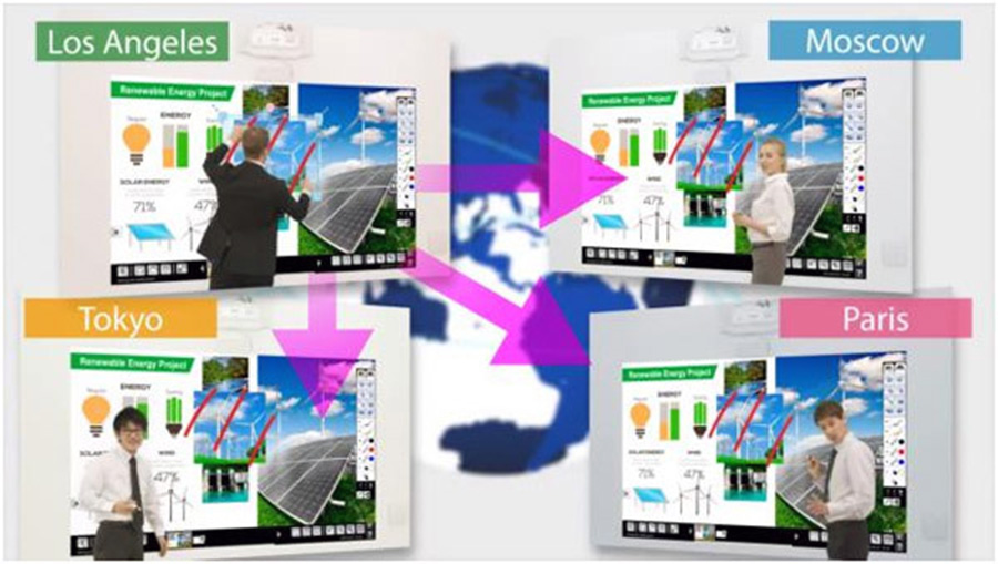 Помимо указанных выше возможностей, у флагманских моделей есть функционал, необходимый для проведения совместных сеансов работы. Можно объединить в один сеанс работы одновременно до 4-х проекторов, находящихся в географически удаленных точках. Во время таких сеансов демонстрируется общий контент, но при этом всем участникам доступны интерактивные инструменты и действие каждого влияет на общий изображение на экране. Данная функция работает как в режиме работы с ПК, где она называется «Multi Location», так и в режиме автономной работы, где она именуется «Whiteboardsharing».