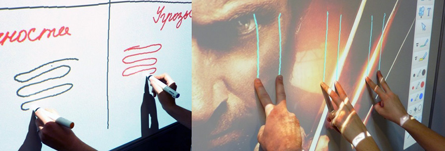Прежде всего, интерактивный проектор позволяет пользователю взаимодействовать с проецируемым изображением. Собственно, так и переводится с английского слово «interactive». Когда нам демонстрируют интерактивные проекторы, обычно показывают, как докладчик рисует что-то поверх проецируемого изображения или перемещает по экрану какие-либо объекты.