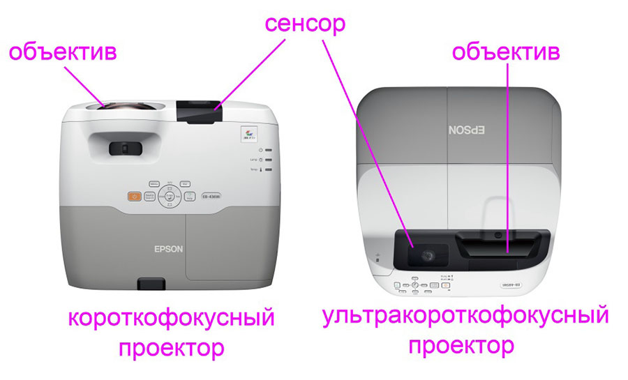 На изображении выше «короткофокусный проектор» – это проектор, который устанавливается как обычно и проецирует картинку на стену «перед собой». «Ультракороткофокусный проектор» устанавливается на ту же стену, на которую проецируется изображение. Такая установка позволяет минимизировать тени на проецируемом изображении при взаимодействии с ним (на рисунке ниже справа изображен ультракороткофокусный проектор в работе):