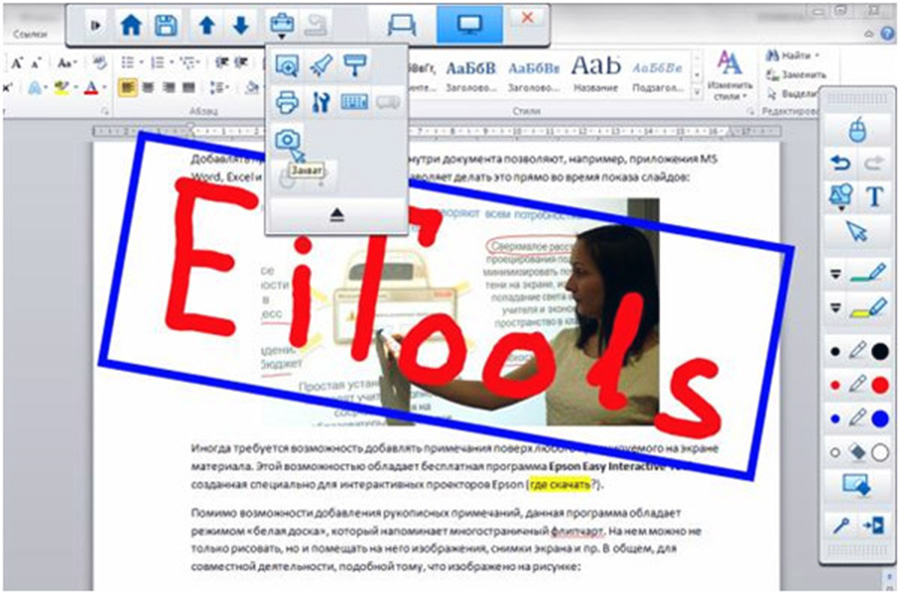А если потребуется возможность добавлять примечания поверх любого проецируемого на экране материала, это позволит сделать бесплатная программа Epson Easy Interactive Tools, созданная специально для интерактивных проекторов Epson.