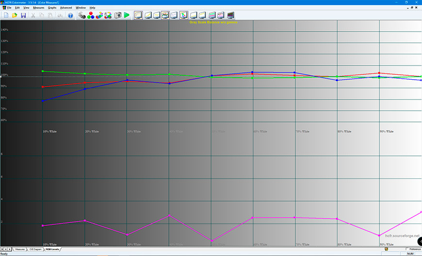 Приступаем к регулировке точки белого. Запускаем файл 50% серого, в программе ColorHCFR включаем автоматическое измерения, нажав на зелёный треугольник типа значка Play. Далее выбираем вкладку с диаграммой СIE и смотрим, куда же попадает жёлтая точка измерений на этой диаграмме. В идеале она должна попасть в самый центр белого фрагмента. Если не точно, то будем подстраивать. Заходим в меню проектора Изображение->Дополнительные настройки цвета->Управление цветом, выбираем строку W: белый, нажимаем ОК. Внизу экрана появляется дополнительное окно с регулировками уровня Красного, Синего и Зеленого цветов. Наша задача – увеличивая или уменьшая числовые значения уровня каждого цвета, максимально точно загнать жёлтую точку результата измерения в нужный нам квадрат. Если попали, то это означает, что мы успешно выставили баланс белого для 50% серого цвета.