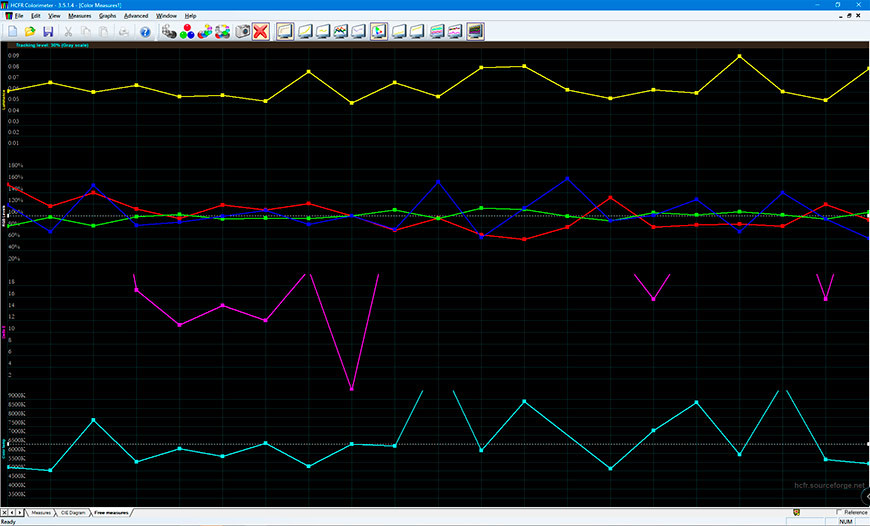 Далее в меню проектора открываем вкладку Изображение->Дополнительные настройки цвета->Управление цветовой температурой. Там две группы параметров: Gain (Уровень) и Offset (Смещение) для трёх основных цветов RGB. На каждый цвет влияние оказывают оба параметра – и Смещение и Уровень, но Уровень больше влияет на светло-серый и белый, а Смещение – на чёрный и тёмно-серый. Поскольку на экране уже выведен светлый серый 80%, то будем пользоваться в основном параметром Уровень. Значения по умолчанию (100 и 256) лучше не превышать, то есть регулировать будем вниз. Сейчас мы видим, что Синий больше других, понижаем Уровень синего чтобы сделать DeltaE ниже 3-х. Вот ещё чуть превышает зелёный – тоже слегка понижаем усиление зеленого. Все получилось, DeltaE у нас ниже 3-х. Теперь запускаем проигрывание файла с тёмно-серым, типа 20% или 30%, в этом случае регулировать будем не усилением, а Смещением: понижаем в тех цветах, где есть превышение над остальными цветами. Наша цель всё та же: DeltaE меньше 3-х. Затем проверяем все остальные файлы с градациями серого подряд от 0% до 100%, и регулируем Сдвиг или Усиление чтобы на всех градациях получить DeltaE меньше 3х. Пройдитесь по всем файлам с градациями серого ещё раз, везде должно быть DeltaE ниже 3х. Если это категорически не получается – придётся жертвовать более тёмным и чёрным, но светлый серый и белый должны быть обязательно меньше 3-х. А ещё лучше – начните этот пункт сначала.
