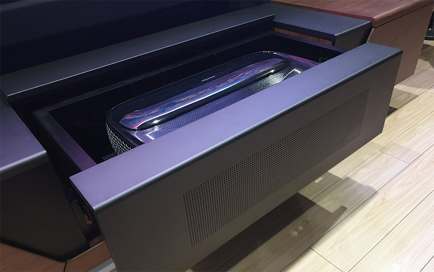 Итак, сердцем входящего в состав комплекта ультракороткофокусного проектора является источник света Trichroma, который прослужит хозяину телевизора не менее 25 000 часов. Как можно догадаться из названия, каждый из трех цветов RGB здесь имеет свой собственный лазерный светодиодный источник. Все они одновременно создают три изображения различного цвета, что обеспечивает более качественное воспроизведение оттенков и равномерную яркость по всему экрану. Это оптимальное решение для создания максимально стабильного, насыщенного и комфортного для восприятия изображения. Производитель особо отмечает, что телевизор покрывает 107% цветового пространства BT.2020, которое даже шире, чем общепринятый стандарт кино DCI-P3.