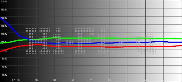 При отключенной функции авторегулировки контраста и настройке по тестовым таблицам яркость белого поля получилась довольно высокой — 234,9 кд/м2, а уровень черного, напротив, достаточно низким для такого типа подсветки и явной настройки на яркое изображение — 0,22 кд/м2. Соответственно, контрастность в режиме on/off составила 1065:1. При выводе на экран шахматного поля она закономерно меньше — 320:1. При этом график яркостного отклика (гаммы) имеет небольшое насыщение в области светлых оттенков. Цветовой же охват (рис. 1) телевизора оптимален и демонстрирует лишь незначительное смещение части промежуточных оттенков. Баланс цветовых компонент (рис. 3) ровный и относительно уравновешенный в большей части диапазона яркостей при выставлении «теплой» цветовой температуры в меню. С ней цветопередача максимально близка к естественной.