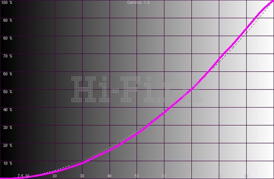 При выборе стандартного диапазона входного сигнала JVC DLA-X700R отображает все градации без какого-либо изменения заводских настроек, причем делает это идеально, что видно на графике яркостного отклика (рис. 2) Уровень черного при выборе любого режима не превышал погрешности измерения наших приборов, то есть был меньше 0,001 кд/м2. Яркость же белого изменялась в зависимости от режима. На 106-дюймовом экране в динамическом режиме она достигала 672 кд/м2, в режиме «Кинотеатр» — 382 кд/м2. Таким образом, контрастность по методу on/off превысила 400 000:1. Цветовой охват (рис. 1) может выходить за границы пространства sRGB. При этом баланс цветов (рис. 3) всегда остается предельно ровным, а соотношение уровней зависит только от заданной в меню температуры. При выборе значения 6000 К действительная цветовая температура составила около 6580 К.