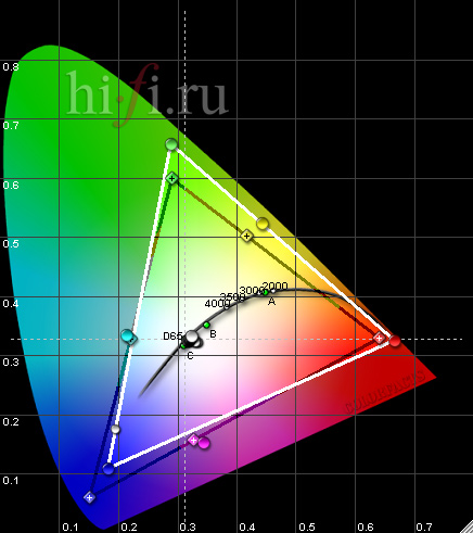 Цветовой охват у Sony VPL-VW85 (рис. 1) необычайно широк и характеризуется превосходной насыщенностью красок (количеством возможных оттенков) в наиболее критичных для восприятия зеленой и красной областях.