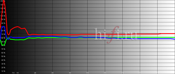 На средней и высокой яркости баланс основных цветовых составляющих фактически идеален (рис. 2), что говорит о корректной цветопередаче Sony VPL-VW85.