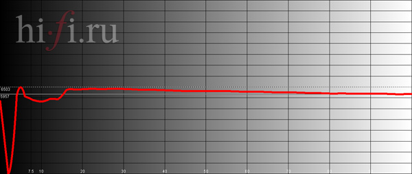 Почти ровная прямая характеристика цветовой температуры (рис. 3) в большей части диапазона говорит о практически идеальной и стабильной передаче оттенков почти во всех сценах за исключением самых темных, где черный и темно-серый цвет могут отдавать то в синеву, то в коричневые тона.