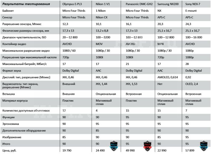 Olympus E-PL3 — это камера на каждый день: наслаждаться, снимать фото и видео — качественно, но без особых изысков. Samsung NX200 — модель для любителей новых технологий и экспериментаторов, не обязательно имеющих большой опыт фото- или видеосъемки; при желании от нее можно добиться очень эффектных результатов. Nikon 1 V1 адресована тем, кто вряд ли завтра же бросится покупать к камере еще пару объективов, чтобы непременно носить на каждую прогулку, несмотря на их весьма скромные размеры. Но это фотоаппарат с очень неплохим качеством съемки и фото, и видео — над своей новой линейкой Nikon поработала на славу. Наши однозначные рекомендации заинтересовавшимся. Panasonic DMC-GH2 создан уже для весьма серьезно настроенных фотолюбителей. По совокупности достоинств и учитывая цену эту модель можно вполне закономерно признать лучшей покупкой с расчетом на дальнейшее развитие как собственного парка фототехники, так и опыта съемок. A Sony NEX-7 — просто великолепный аппарат вне зависимости от цены. Снимает он прекрасно, да и по жизни удобен. Хотя и дорог. Но не порекомендовать его к рассмотрению мы никак не можем.