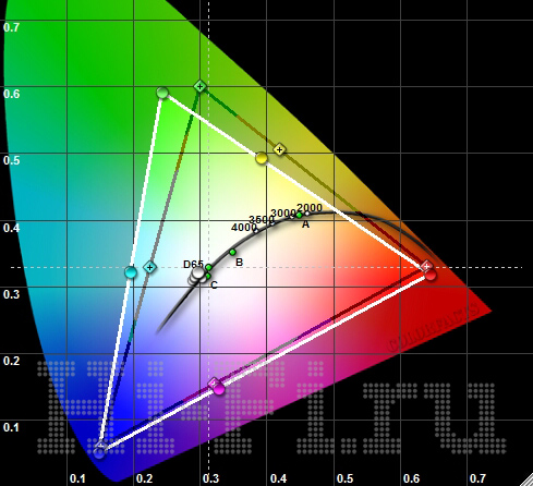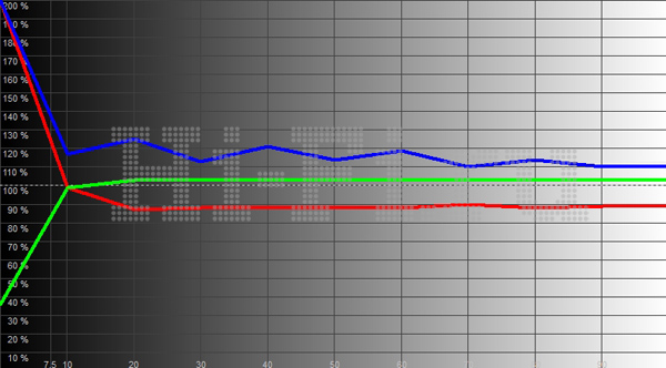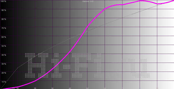 После отключения динамических регулировок телевизор Samsung PS51D550 перестает выключать питание на панели при показе черного цвета, оставляя небольшое свечение пикселей. Реальный уровень черного при этом составляет 0,011 кд/м2, яркость полного белого поля еще слегка снижается — до 41,77 кд/м2, и в итоге реальная контрастность модели равна 3797:1. В то же время график яркостного отклика (рис. 2) четко показывает, что при отключении динамических настроек все градации отображаются не просто некорректно, а намеренно неправильно. Цветовой охват достаточно широкий, и от идеального его отличает только небольшое смещение точки зеленого цвета (рис. 1). Цветовой баланс ровный по диапазону яркостей, что говорит о стабильной цветопередаче (рис. 3). При выборе самого теплого пресета он почти уравновешен, отчего реальная температура лишь немного превышает 7000 К.