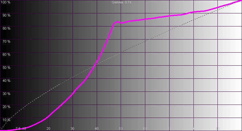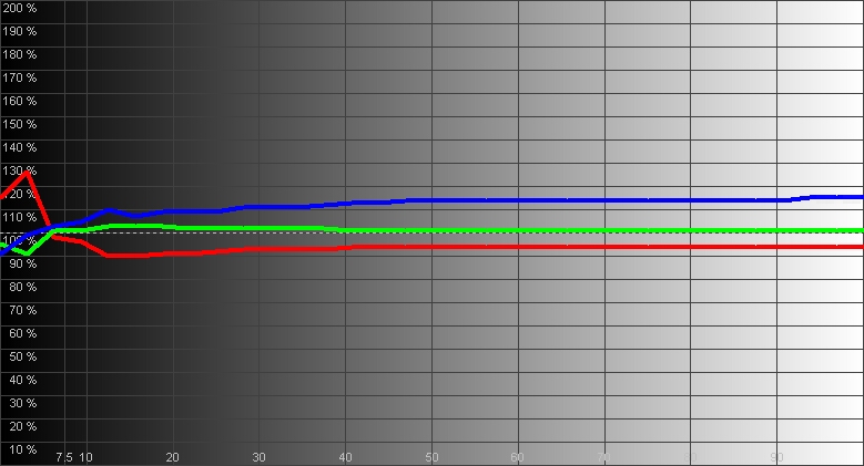 Видеопроцессор телевизора LG OLED65G6V бережет панель, не имеющую принудительного охлаждения, ограничивая пиковую яркость на больших участках картинки. В итоге, при выводе белого поля на весь экран, яркость не превышает 113 кд/м2. На «шахматном поле» яркость белых участков повышается до 224 кд/м2, а на участках размером с ладонь на темном фоне она достигает 380 кд/м2. При этом уровень черного вне зависимости от площади остается нулевым. Но контрастность в данном случае получается не только математически – она и субъективно воспринимается невероятной. При этом все градации на краях диапазона отображаются безукоризненно, хотя в общем график яркостного отклика (рис.2) не выглядит идеально. Зато цветовой охват (рис.1) у данной модели можно назвать образцовым он предельно широк и почти не имеет смещения промежуточных точек. Столь же идеален и цветовой баланс (рис.3), приводящий к постоянству температуры по всему диапазону на уровне 6900К при выборе «теплой» настройки в меню.