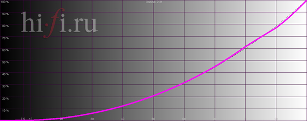 Ширина цветового охвата средняя по тесту. Следует отметить незначительное смещение основных и промежуточных цветов от референсных координат. Исключение составляет зеленая компонента, которая смещена существенно больше (рис. 1). Яркостный отклик практически совпадает с идеальной для видеоустройств кривой, не имея значительных провалов и насыщений (рис. 2). Баланс цветов ровный практически во всем диапазоне с незначительным преобладанием синего в темных участках (рис. 3). Цветовая температура стабильна и составляет 6700 К. Измеренная контрастность при отключенной системе управления подсветкой самая низкая в тесте — 250:1.