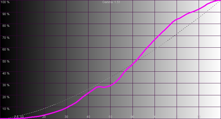 Измерения проводились в затемненном помещении на экране с диагональю 106 дюймов и коэффициентом отражения 1.0. В качестве отправного был выбран Пользовательский режим, позволяющий проводить полный спектр настроек изображения, но при этом не купирующий цветовые характеристики модели. Цветовой охват (рис.1) у нее оказался даже больше, чем у BenQ W1700, и почти совпал со стандартным треугольником ВТ.709 при минимальном смещении крайних координат. При выборе нормальной цветовой температуры в меню баланс цветовых составляющих (рис.3) относительно ровен, но показывает значительный перевес синей составляющей, однако визуально изображение не отдает в синеву. Наоборот, при теплой температуре оно имеет бурый отлив. То есть проектор изначально настроен именно на такие параметры, хотя реальная цветовая температура при этом на большей части диапазона яркостей явно выше рекомендованных 6500К. Яркость белого в режиме работы лампы SmartEco превышает 532 кд/м2, а уровень черного – 0,341 кд/м2. В режимах Спорт и Футбол они повышаются соответственно до 839 и 0,518 кд/м2.