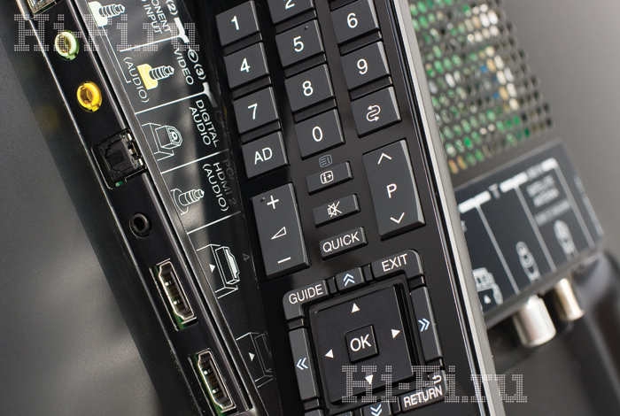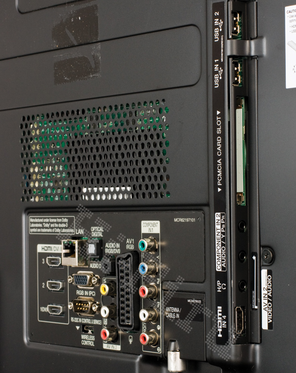 Чтобы телевизор лишь минимально отступал от поверхности при настенном креплении, все разъемы на его тонком (меньше 29 мм) корпусе спрятаны в нишу и развернуты вниз и вбок. Среди них надо назвать четыре HDMI, переходные порты для аналоговых входов и оба антенных гнезда, одно из которых предназначено для эфирного и кабельного сигнала, а второе для спутниковой антенны. Ведь в Toshiba 46VL748R стоит мультиформатный ТВ-тюнер, принимающий как стандартные аналоговые, так и цифровые трансляции нескольких видов: эфирные DVB-T, включая HD-программы по стандарту DVB-T2, кабельные DVB-C и спутниковые DVB-S/S2. Естественно, поддерживается кодировка Н.264.