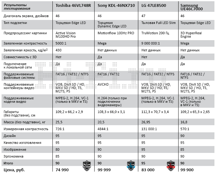 После того как был отсмотрен последний фрагмент на последнем участнике, у нас исчезли какие-либо сомнения относительно того, кто станет победителем теста и обладателем знака Best Buy. Чуть сложнее было определить будущего обладателя серебряной награды и, соответственно, аппарат, достойный нашей рекомендации. Здесь в противоборство вошли функциональность телевизора и его умение добиваться наивысшего качества картинки при фактически равных начальных конструктивных условиях. В итоге рекомендацию журнала получает Sony KDL-46NX710, создатели которого, использовав стандартную боковую подсветку Edge LED, даже в корпусе с единой панелью из черного стекла смогли получить впечатляющее по качеству изображение с поразительной для аппаратов такого типа контрастностью и великолепным эффектом объема в 3D-фрагментах. Модель Samsung UE46C7000 покорила нас своими возможностями, включающими даже конвертацию обычного видео в 3D. Но у Toshiba 46VL748 в сравнении с ней медиапроигрыватель оказался лучше, что в обычной жизни более актуально, поэтому она получает наш знак Editor’s Choice.