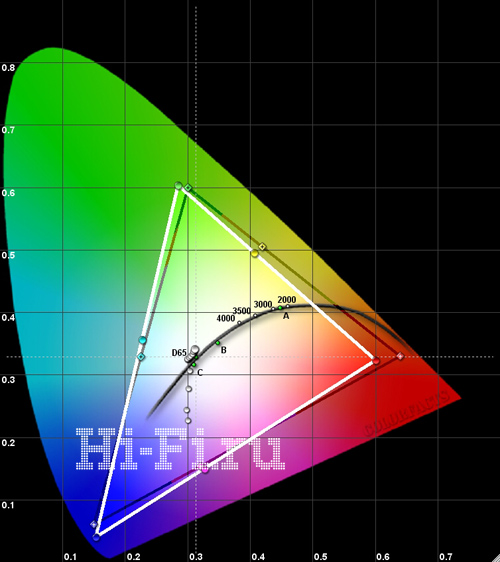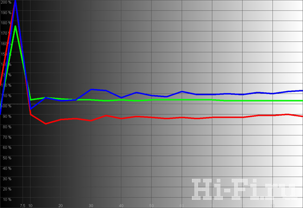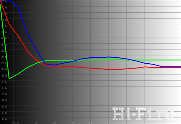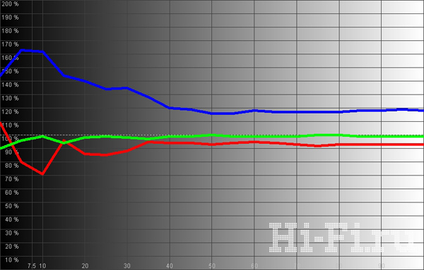 Цветовой охват достаточно широкий и соответствует стандартам HDTV (рис. 1). Смещение крайних точек весьма незначительное, а синяя область проработана на редкость хорошо. Правда, и точка белого тоже смещена в сторону синего даже при выставлении теплой цветовой температуры, что видно и на балансе цветовых компонент (рис. 3). Соответственно, и фактическая температура почти во всем диапазоне явно завышена, составляя в среднем 8500 K. Что характерно, при этом желтый цвет и телесные оттенки передаются весьма натурально. Яркость при таких настройках и отключенных динамических регулировках получилась весьма низкая — 43,6 кд/м2, но и уровень черного тоже опустился до почти рекордного для таких аппаратов уровня 0,009 кд/м2. В итоге контрастность в одном кадре (!) достигла 4844:1.