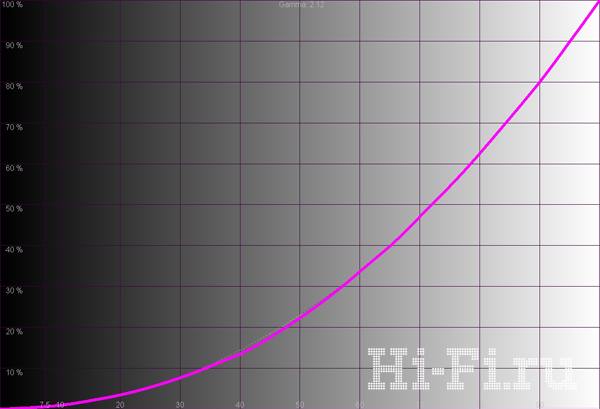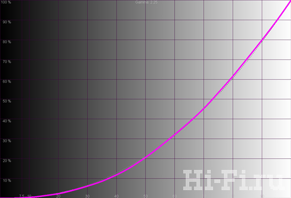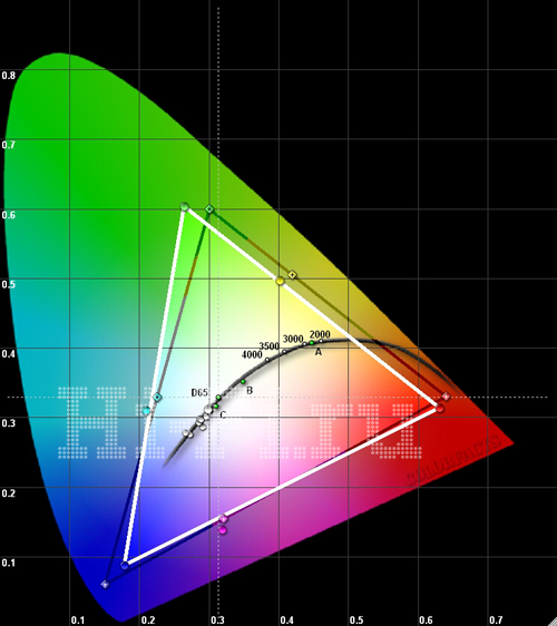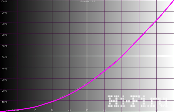 У модели LG 47LE8500 охват тоже соответствует стандартам HDTV: он достаточно широк, а крайние точки на нем почти не имеют смещения (рис. 1). Синяя область великолепно проработана, однако точка белого практически совпадает с референсным значением. Баланс цветов при выборе теплого пресета в меню оптимально уравновешен (рис. 3), делая цветовую температуру стабильной почти во всем диапазоне яркостей. При отключенных автоподстройках гаммы, контраста и яркости, но активированной локальной подсветке реальная контрастность становится фактически бесконечной — в черных участках панель вовсе перестает светиться, даже на шахматном поле. Яркость белого при этом составляет 131 кд/м2, а идеальный график гаммы (рис. 2) подтверждает отсутствие вмешательства разного рода «улучшайзеров».