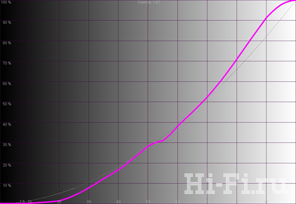 Цветовой охват в стандартном режиме достаточно широкий, с незначительным смещением крайних точек и практически полным отсутствием сдвига промежуточных цветов (рис. 1). Баланс же цветовых компонент находится в относительном равновесии только при выборе самой теплой настройки цветовой температуры, но при этом неравномерен по диапазону (рис. 3), отчего температура в зависимости от яркости заметно меняется, колеблясь рядом с отметкой 7000 K. Максимальная яркость при настройке по тестовым таблицам была равна 110 кд/м2, уровень черного 0,152 кд/м2. В итоге контрастность составила 726:1, а на шахматном поле еще меньше — 568:1. При этом кривая гаммы (рис. 2) так и не приблизилась к рекомендованной, демонстрируя потерю разборчивости деталей в темных и ярких участках.