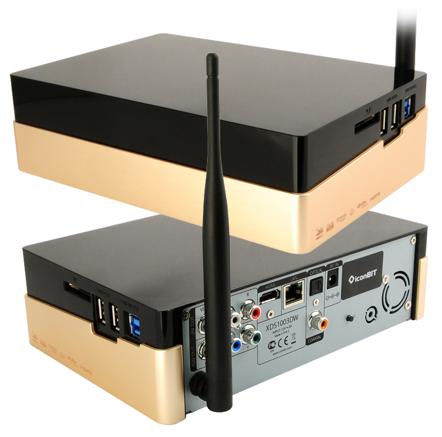 iconBIT XDS1003DW является не просто утилитарным проигрывателем или, как сейчас модно говорить, центром развлечений, он еще и красавец: «золото» в сочетании с «черным стеклом» выглядит шикарно. Пускай это лишь стилизация, но глаз разуется. А чтобы он радовался дольше, протирайте нежный глянцевый пластик только микрофиброй. Корпус плеера имеет стандартную по расположению коммутационную панель с аналоговыми выходами, HDMI v1.4 и гигабитной «сетью» (Wi-Fi также имеется), а на правом боку можно найти пару портов USB, слот для карты памяти и, почему-то, ведомый USB 3.0 для подключения плеера к компьютеру в качестве накопителя. Нет, само по себе решение очень полезное – благодаря ему информацию можно перебросить с максимальной скоростью. Но почему этот порт сделали сбоку, а не сзади? Нашлось в корпусе место и для полноразмерного жесткого диска (в комплект не входит) стандарта SATA. Правда, доступ к накопителю сделан не очень удобным – через днище плеера. Подразумевается, что HDD ставится «раз и навсегда», потому что быстрый доступ к данным реализован в ассортименте. Плеер базируется хоть и не на самом крутом, но зато уже специализированном чипсете Realtek RTD1186DD, и предлагает весьма широкую совместимость с медиаконтентом. Реализована поддержка и 3D-видео, и HD-звука (при выводе через HDMI). По части типовых файлов и контейнеров ситуация весьма неплохая, однако то тут, то там вылезают мелкие «глючки», а скорость работы проводной сети все же далека до заявленного гигабита. Впрочем, с последними программными обновлениями количество сбоев снизилось до приемлемого минимума. Чего не скажешь про удобство второй операционной системы – Android. Да, в плеере сразу две операционки. Одна «плеерная», базирующаяся на Linux. Вторая, Android – для приложений. Кроме того, скорость работы интерфейса и его организация оставляют ряд вопросов. Тем не менее, ради относительно невысокой цены кто-то сможет закрыть глаза на недостатки модели, большинство из которых относится к второстепенному функционалу. Качество картинки у данного плеера субъективно выше, чем у рассмотренных ранее Android-плееров, но уступает моделям на базе более дорогих чипов Sigma Designs (например, Dune). Впрочем, огромная разница в цене с теми же Дюнами с лихвой компенсирует этот аспект.