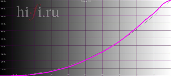 Цветовой охват проектора достаточно широк, хотя координаты опорных цветов существенно смещены. Баланс белого тяготеет к холодным оттенкам даже в наиболее подходящем для просмотра кино режиме real (рис. 1). При этом немного завышенная цветовая температура остается практически постоянной во всем диапазоне яркостей вплоть до самых низких значений. Отклонения гаммы от референсной кривой находятся в пределах нормы (рис. 2).