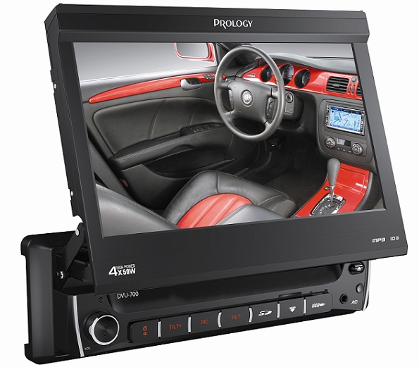 Очередным представителем автомобильных головных устройств Prology, в которых не предусмотрен дисковый проигрыватель, стал мультимедийный центр DVU-700 монтажного размера 1DIN. Он оснащен моторизированным сенсорным дисплеем диагональю 7 дюймов. При подключении камеры заднего вида, для чего предусмотрен специальный видеовход, картинка будет транслироваться прямо на экран, существенно облегчая водителю процесс парковки. Аппарат с максимальной выходной мощностью 4 х 55 Вт имеет порт USB, слот для карты памяти SD и AV-вход mini jack на передней панели. Также он располагает AV-входом RCA, 4.1-канальным аудиовыходом и видеовыходом RCA, с помощью которого в систему несложно интегрировать дополнительный монитор. В арсенале модели присутствует цифровой PLL-тюнер с памятью на 30 радиостанций. В комплект поставки новинки включен пульт ДУ, управление также может осуществляться при помощи резистивных кнопок на руле – Prology DVU-700