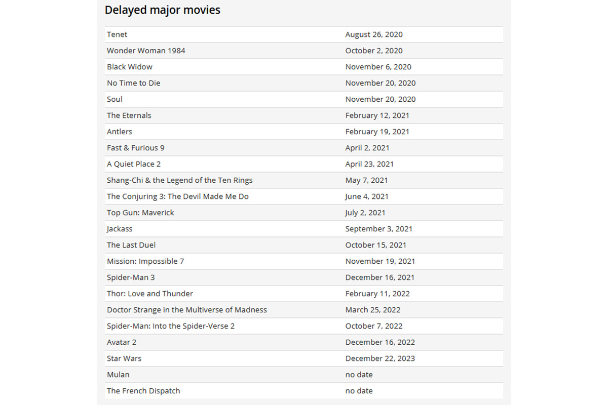 Последствия пандемии коронавируса продолжают проявляться. На прошедшей неделе стало известно, что в очередной раз отложены премьеры крупных голливудских кинопроектов, запланированные на этот год. Среди них такие блокбастеры как «Аватар 2», «Звездные войны», «Тихое место 2», «Топ ган: Мэверик» и «Человек-паук 3». Откладывается премьера «Довода», а диснеевский «Мулан 2» вообще лишился даты премьеры. «Форсаж 9» отодвинут на апрель следующего года, а «Миссия невыполнима 7» – на ноябрь. Причем, некоторые фильмы ложатся на полку в практически готовом состоянии, а по некоторым проектам приостановлено производство из-за карантинных мер.