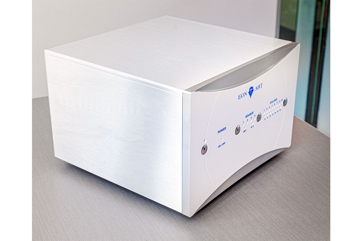 Моноблок оснащен четырьмя аналоговыми входами RCA и слотом для опциональных входных модулей — RCA, XLR, фонокорректора MM и ЦАП. В секции предварительного усиления работают лампы E88CC JJ TESLA (6922/6H23N-EB), а в его блоке питания — JJ TESLA 1 x 5AR4/GZ34, 1 x 12AX7, 2 x 6V6G, 1 x 0B2. В схеме применены конденсаторы аудиофильского качества от Duelund, Mundorf, Amtrans, Clarity и Solen, а также тонкопленочные резисторы и специально отобранные транзисторы. Регулятор громкости здесь полностью электронный, без каких либо переключателей или механических переменных резисторов. В Eon Art заявили, что вместе с топологией схемы это обеспечило более низкие искажения, чем у классических схем регулировки громкости.