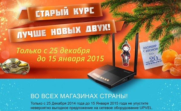Для тех, кто еще не купил подарки к Новому году или планирует на праздниках ускорить домашнюю сеть Wi-Fi, с 25 декабря 2014 до 15 января 2015 года компания Upvel заморозила цены на самые популярные модели роутеров по курсу 50 рублей за доллар. Cверхкомпактный 3G/LTE Wi-Fi-роутер UR-312N4G обойдется желающим в 1290 руб., высокоскоростной аппарат UR-337N4G стоит всего 1890 руб., двухдиапазонный 3G/LTE Wi-Fi-роутер UR-515D4G можно приобрести за 3190 руб. В акции участвует больше полутора десятков устройств. Полный список техники с ценами доступен на странице акции