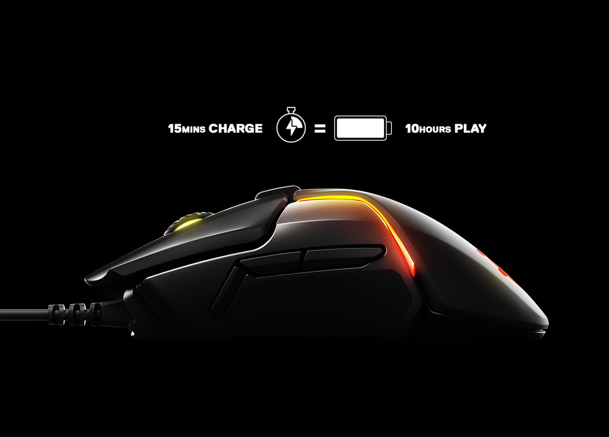 В Rival 650 Wireless используется беспроводная система Quantum Wireless 2.4 GHz с частотой обновления 1 000 Гц (1 мс), обеспечивающая максимально низкую задержку и надежное подключение. Кроме того, Rival 650 Wireless – это первая беспроводная мышь с функцией быстрой подзарядки. При подключении к USB-порту, поддерживающему быструю зарядку (и с учетом выбранного профиля RGB-подсветки), даже пять минут могут обеспечить более трех часов работы, а зарядка продолжительностью 15 минут позволит использовать мышь в течение 10 часов.