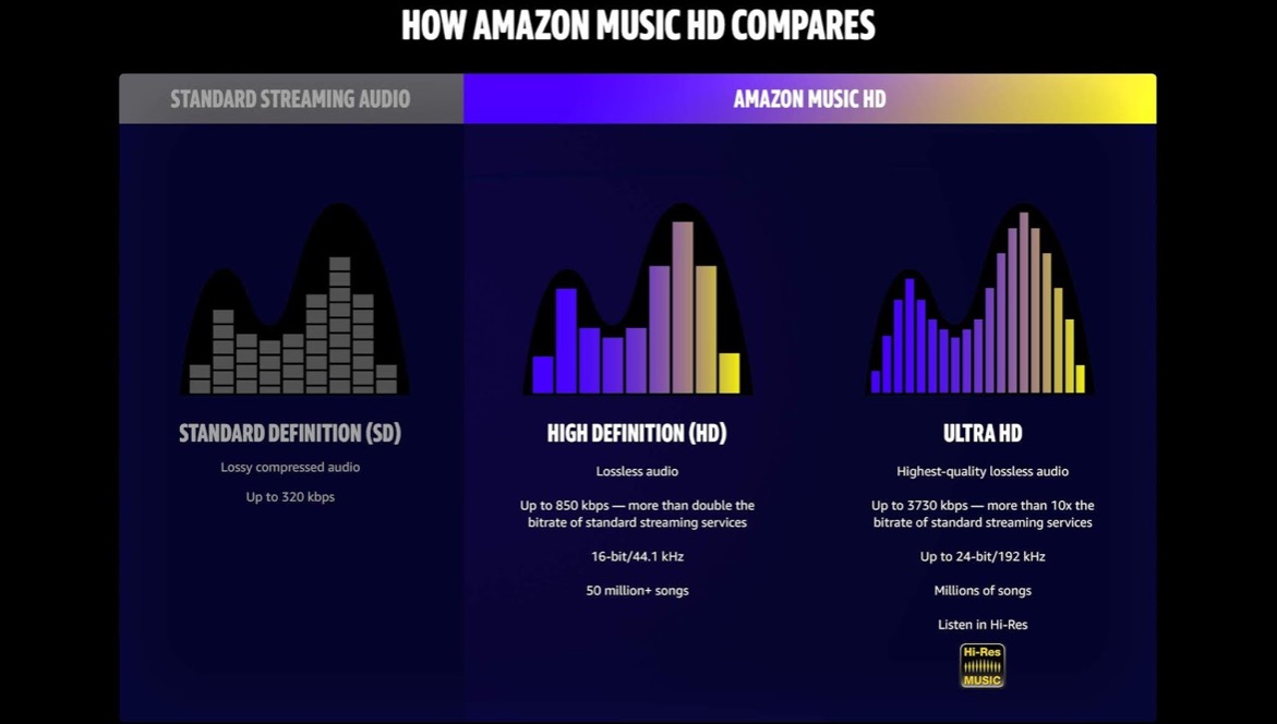 Amazon Music HD предлагает 50 млн. треков в форматах 16/44 (850 кбс) и 24/192 (3 730 кбс). Цены стартуют от $12,99 в месяц, семейные пакеты предлагаются за $19,99 в месяц. На рынке стриминга становится очень горячо - ждем скоро начало DSD-трансляций, иначе как можно будет выделиться?