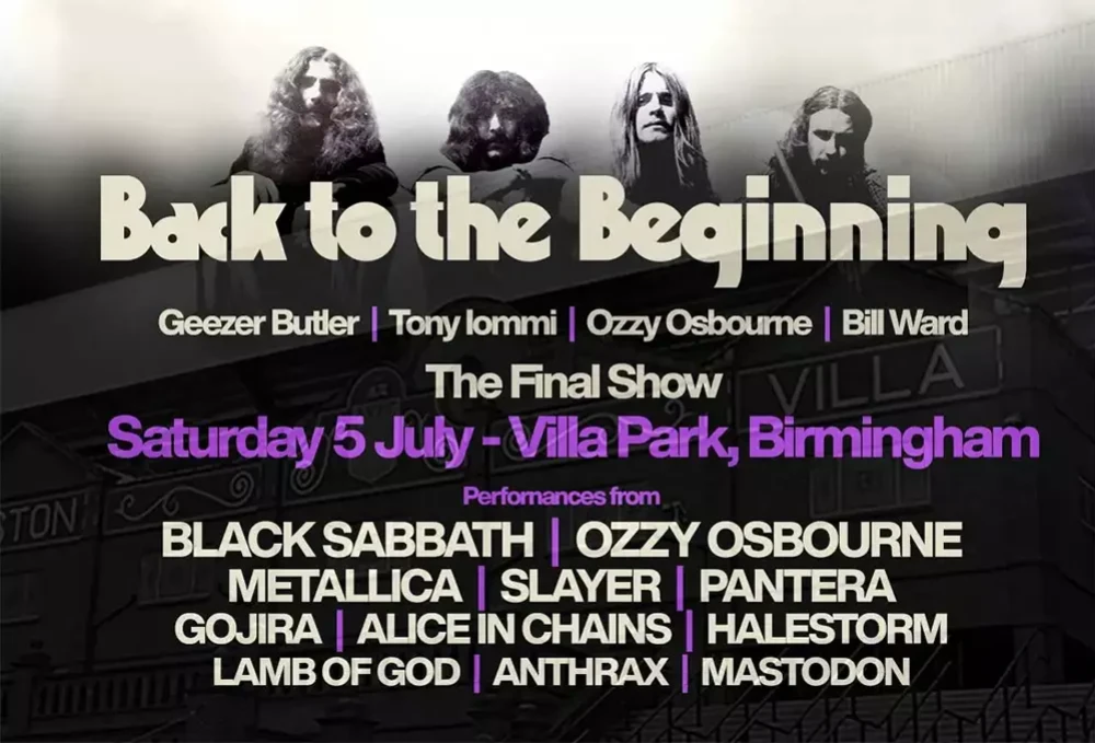 Шоу Back To The Beginning запланировано на 5 июля 2025 года в Villa Park в Астоне, Бирмингем. Как ожидается, это будет последнее живое выступление Князя Тьмы и оригинального состава Black Sabbath: Оззи Осборна, гитариста Тони Айомми, басиста Гизера Батлера и барабанщика Билла Уорда. Легенд тяжелого рока поддержат многие знаковые группы, вдохновленные пионерами хэви-метала: Metallica, Lamb Of God, Slayer, Pantera, Gojira, Alice In Chains, Mastodon, Halestorm и Anthrax.