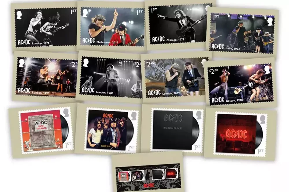 В основе почтовых марок – восемь фотографий живых выступлений в разные годы их продолжительной карьеры, а также четыре марки, посвящённые обложкам альбомов High Voltage, Highway to Hell, Back in Black и Power Up.