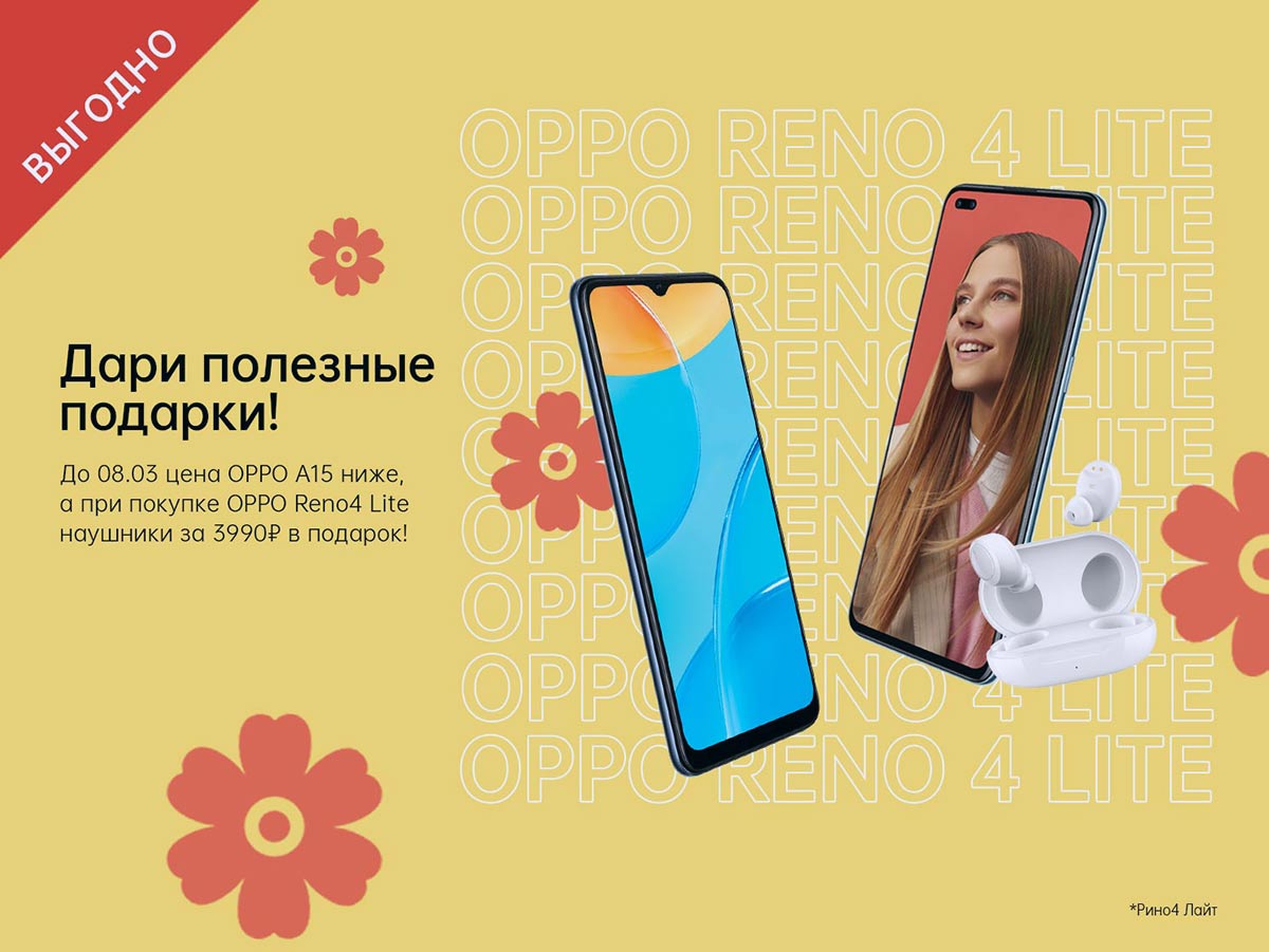 В этот же период OPPO предлагает покупателям уникальную возможность – праздничный набор! В течение первой недели марта в подарок к смартфону Reno4 Lite идут беспроводные наушники Enco W11!