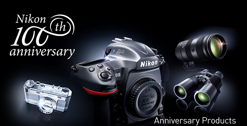 В честь своего столетия компания открывает прием заказов на юбилейные товары Nikon. Все желающие смогут приобрести продукцию из ограниченной серии. Юбилейный выпуск моделей D5 и D500 отличается темно-серой отделкой под металл и логотипами столетия. Камеры поставляются в металлическом кейсе, в который также вложен кожаный ремень. Помимо этого, компания подготовила ограниченную серию объективов NIKKOR. Все желающие смогут приобрести NIKKOR 70-200E (AF-S NIKKOR 70-200mm f/2.8E FL ED VR) 100th Anniversary Edition. В набор входит отдельная подставка, на которой демонстрируется внутренняя конструкция объектива и расположение стеклянных элементов. Фотографам также доступен комплект из трех зум-объективов NIKKOR F2.8 100th Anniversary Edition, в который вошли широкоугольный AF-S NIKKOR 14-24mm f/2.8G ED, стандартный AF-S NIKKOR 24-70mm f/2.8E ED VR и телеобъектив AF-S NIKKOR 70-200mm f/2.8E FL ED VR. На всех моделях выгравирован одинаковый серийный номер.