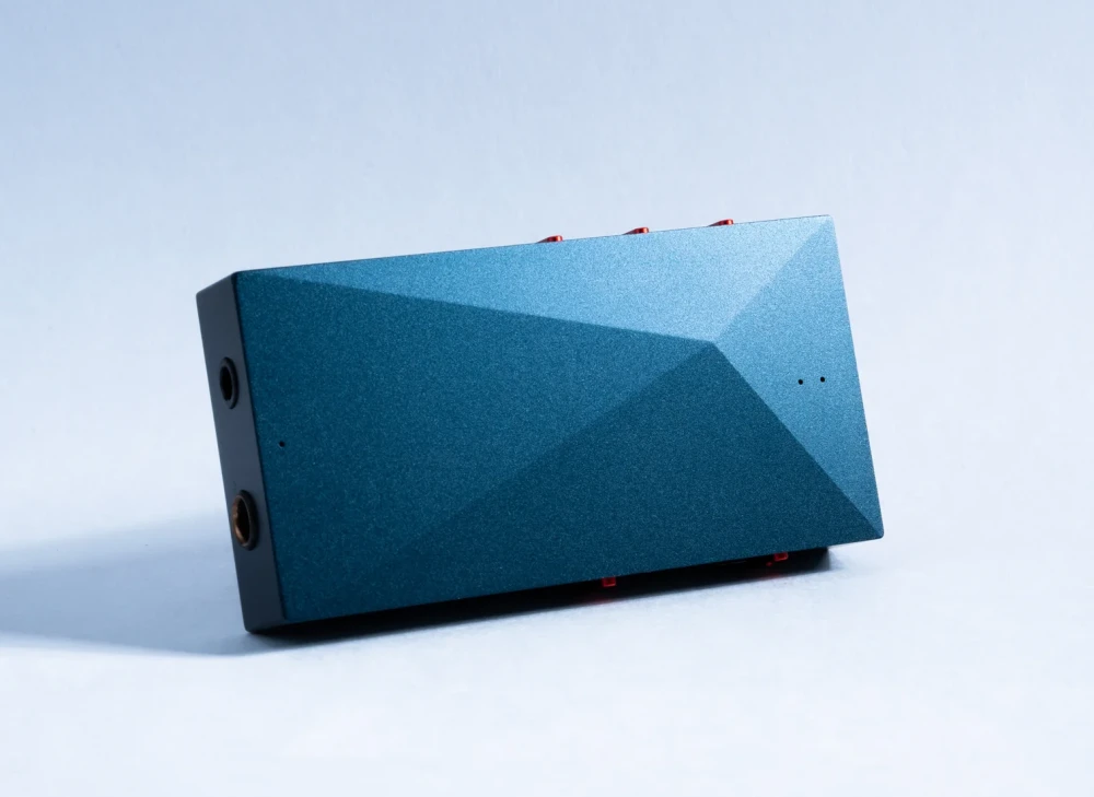 Корпус устройства выполнен из анодированного алюминия, встроенные светодиоды показывают статус и уровень заряда батареи, а также тип и частоту дискретизации поступающего цифрового сигнала. Для управления питанием, громкостью и воспроизведением на торцах корпуса расположены вертикальные физические клавиши красного цвета. Весит устройство всего 62 грамма.