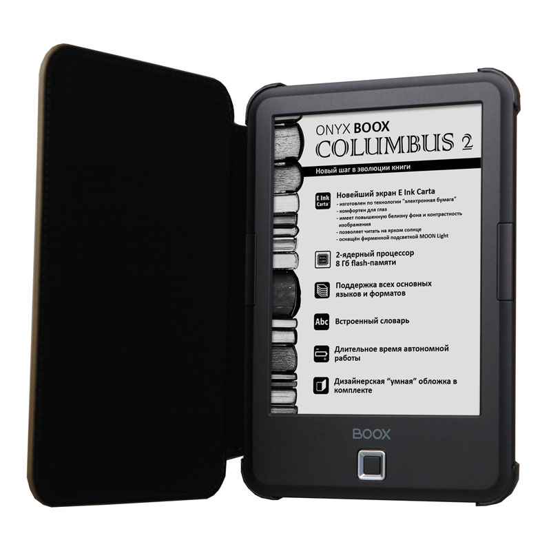 ONYX BOOX Columbus 2 выполнен в компактном и легком корпусе, поддерживает все популярные форматы файлов и позволяет читать документы на большом количестве европейских и азиатских языков. В комплекте с устройством поставляется стильная «умная» обложка, обеспечивающая его защиту, а при закрытии автоматически переводящая его в спящий режим.