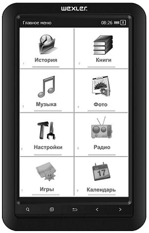 Благодаря использованию 7-дюймового дисплея типа E-ink электронная книга Wexler.Book E7001 имеет очень низкое энергопотребление, а встроенный литиево-полимерный аккумулятор емкостью 1500 мАч обеспечивает ее автономную работу в течение нескольких недель даже при интенсивном чтении. Устройство оснащено 4 Гбайт внутренней памяти, вмещающей до 100 тысяч книг и расширяемой при помощи карточки формата SD емкостью до 32 Гбайт. Отдыхая от чтения, владелец букридера может послушать аудиозаписи либо программы FM-радио и посмотреть фотографии. В комплект поставки Wexler.Book E7001