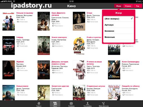 сразу стало набирать популярность именно среди владельцев планшетных компьютеров. Удобство просмотра тысяч фильмов на экране планшета, который всюду можно взять с собой, привлекала все новых и новых пользователей. Сегодня аудитория приложения – более полумиллиона человек, совершающих более 10 000 000 просмотров видео в месяц. Более 85% всех просмотров приходится на кино и мультфильмы. Сериалы, документальное кино и телепрограммы составляют оставшиеся 15% показов.