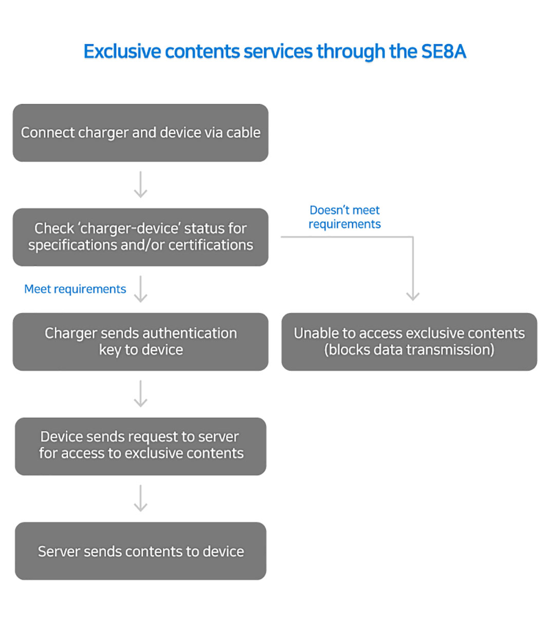 Samsung SE8A – первое в отрасли решение, объединяющее контроллер питания и элементы обеспечения безопасности Secure Element (эквивалент CC EAL5+) в одном чипе, реализуя дополнительные меры защиты, такие как хранение ключа безопасности, а также кодирование и декодирование конфиденциальных данных в устройстве компактного форм-фактора. SE8A поддерживает аутентификацию USB Type-C Authentication, программу, основанную на сертификатах для зарядных устройств и другой техники USB Type-C, которая предотвращает некорректное использование неавторизированных продуктов. Повышенная безопасность SE8A открывает возможности для новых видов контента и услуг, эксклюзивных для определенного бренда, местоположения или события.