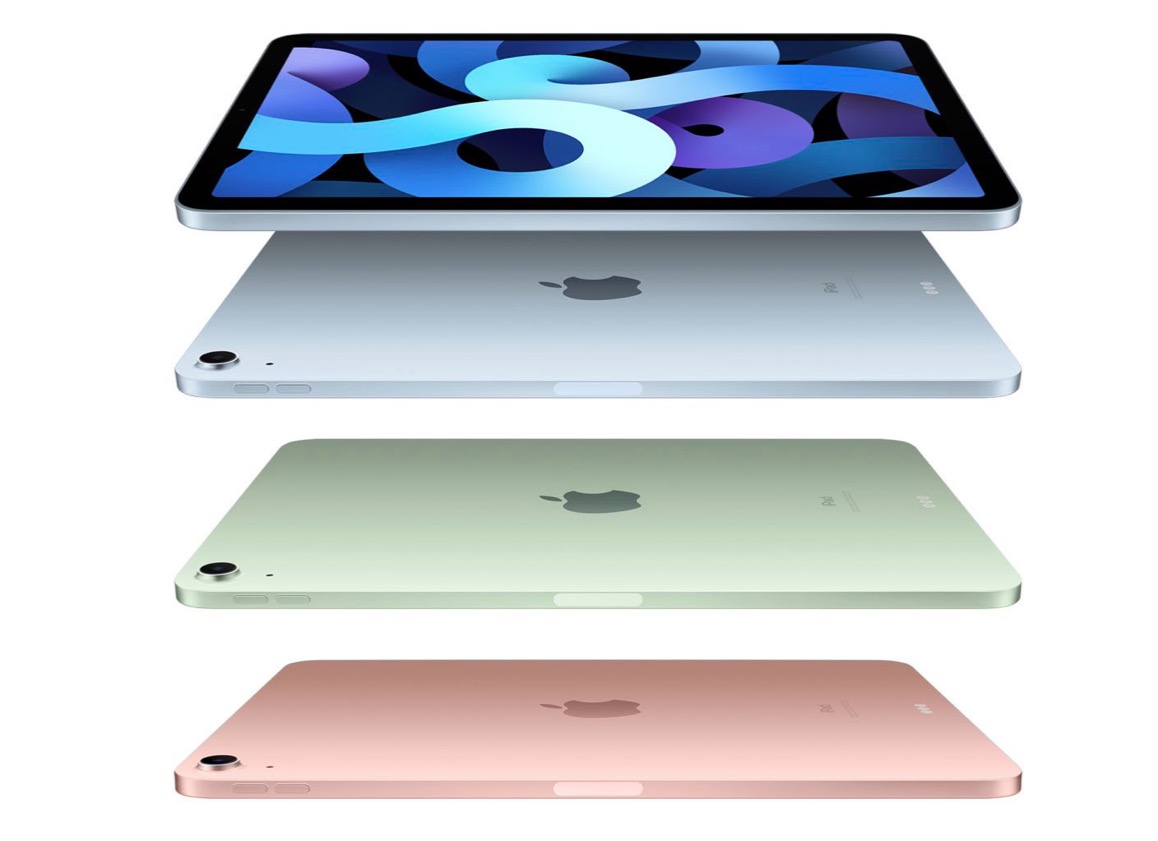iPad Air 4 (от от 55 990 руб. за Wi-Fi/64 Гб) выполнен в дизайне iPad Pro, имеет сканер отпечатка пальца и щеголяет новым экраном Liquid Retina Display с разрешением 2 360 х 1 640 точек.