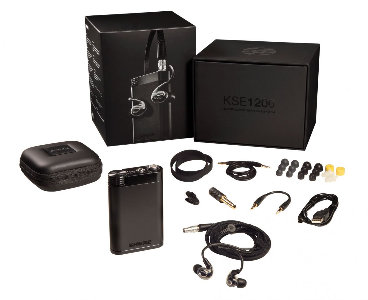 В прошлом году компания Shure удивила всех, представив довольно дорогую систему KSE1500. Новая версия Shure KSE1200 включает в себя такие же электростатические наушники, что и флагманский комплект, однако за счет применения другого блока питания, также содержащего в себе ЦАП, цену удалось снизить на треть. Электронный блок, входящий в систему KSE1200, лишился встроенного эквалайзера и ЖК-экрана, также до 12 часов снизилось и время автономной работы. Зато новинка стоит в Европе всего 2000 евро, что на целую тысячу евро дешевле KSE1500.
