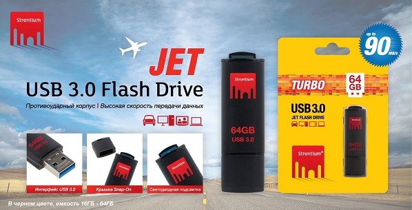Серия USB-накопителей Strontium JET USB 3.0 насчитывает три модели разной вместимости: 16, 32 и 64 Гбайт. Все они выполнены в черном металлическом ударопрочном корпусе. Разъем USB защищен съемным колпачком, а на торце гаджета имеется светодиод, служащий для обозначения подключения к системе. Отличительная черта носителей – высокая скорость обмена информацией. У модели на 16 Гбайт скорость чтения составляет до 35 Мбайт/с, скорость записи – до 20 Мбайт/с. У 32- и 64-гигабайтных версий Strontium JET USB 3.0