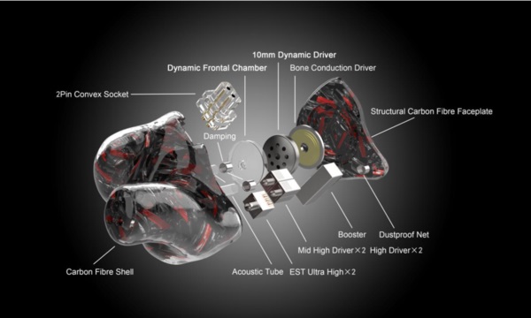 В каждом вкладыше установлены по восемь драйверов, организованных в пять групп, каждая из которых отвечает за свою часть диапазона. Причем конфигурация получилась гибридная – динамик с мембраной 10 мм работает на басу, три пары арматурных драйверов озвучивают средние и высокие частоты, а в роли супертвитера выступает пьезоэлектрический драйвер, работающий за счет эффекта костной проводимости звука. Именно благодаря его применению заявленный частотный диапазон составляет от 20 до 55 000 Гц. Корпус наушников полностью выполнен из карбонового волокна, чусвстивтельность составляет 118 дБ, номинальное сопротивление – 14 Ом.