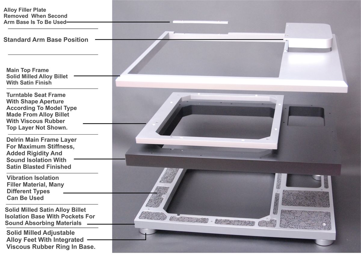 Acoustands Twin Arm Delrinium Plinth собрана из пяти слоев - используется алюминий, композиты, применена засыпка. База для тонарма устанавливается любая (9 или 12'