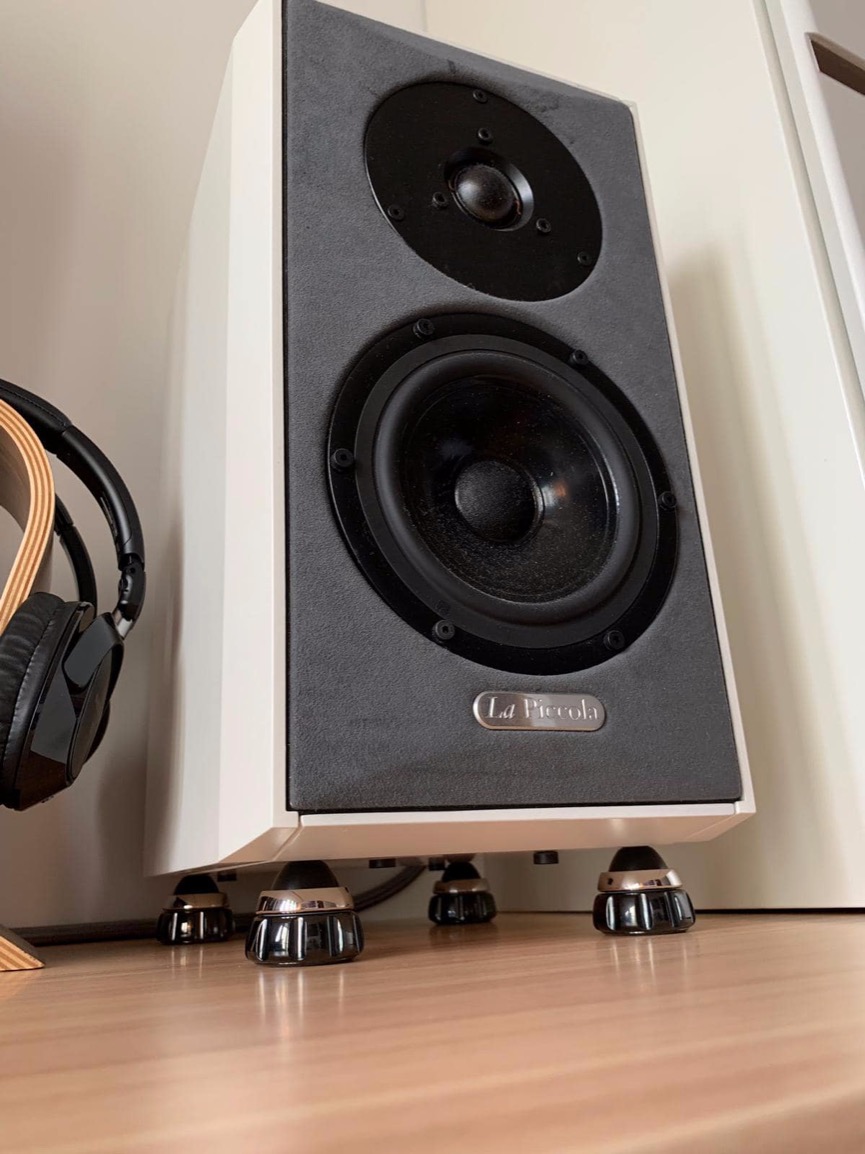Artheluthe La Piccola кабинетных резонансов. Компания рекомендует дополнительно развязывать колонки от поверхности (даже при использовании стоек) - например, через опоры ReVopod (на фото) - так саунд получается более открытым и прозрачным.
